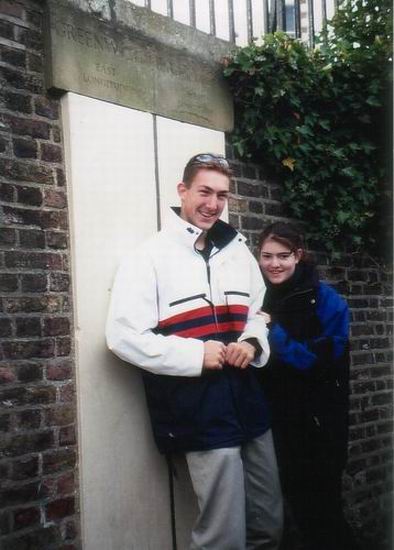 Meine Schwester beim vergeblichen Versuch, mich in den Osten abzuschieben. Direkt auf dem Nullmeridian in Greenwich. Aufgenommen bei einem Kurzurlaub in London im Herbst 2000 |